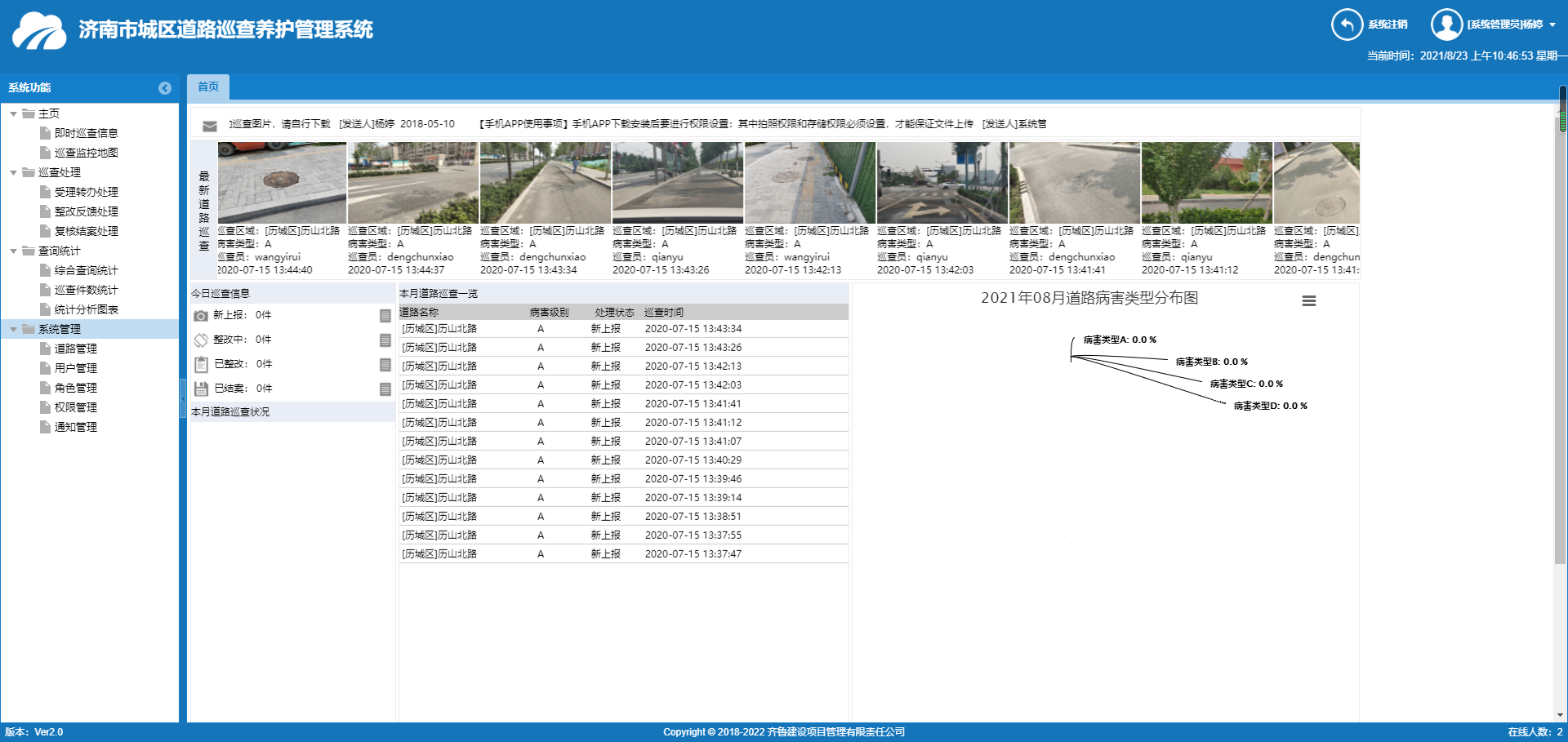 濟南市城市道路病害巡查信息系統(tǒng)是服務于濟南市交通局城市道路養(yǎng)護工作的管理信息平臺系統(tǒng),具備查詢統(tǒng)計、巡查處理、系統(tǒng)管理以及主頁四大模塊于一體。